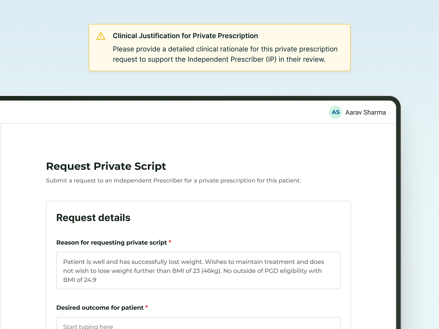 Move beyond transactional care. The platform tracks long-term data, allowing you and the patient to visualise health trends—like weight or blood pressure—over time.